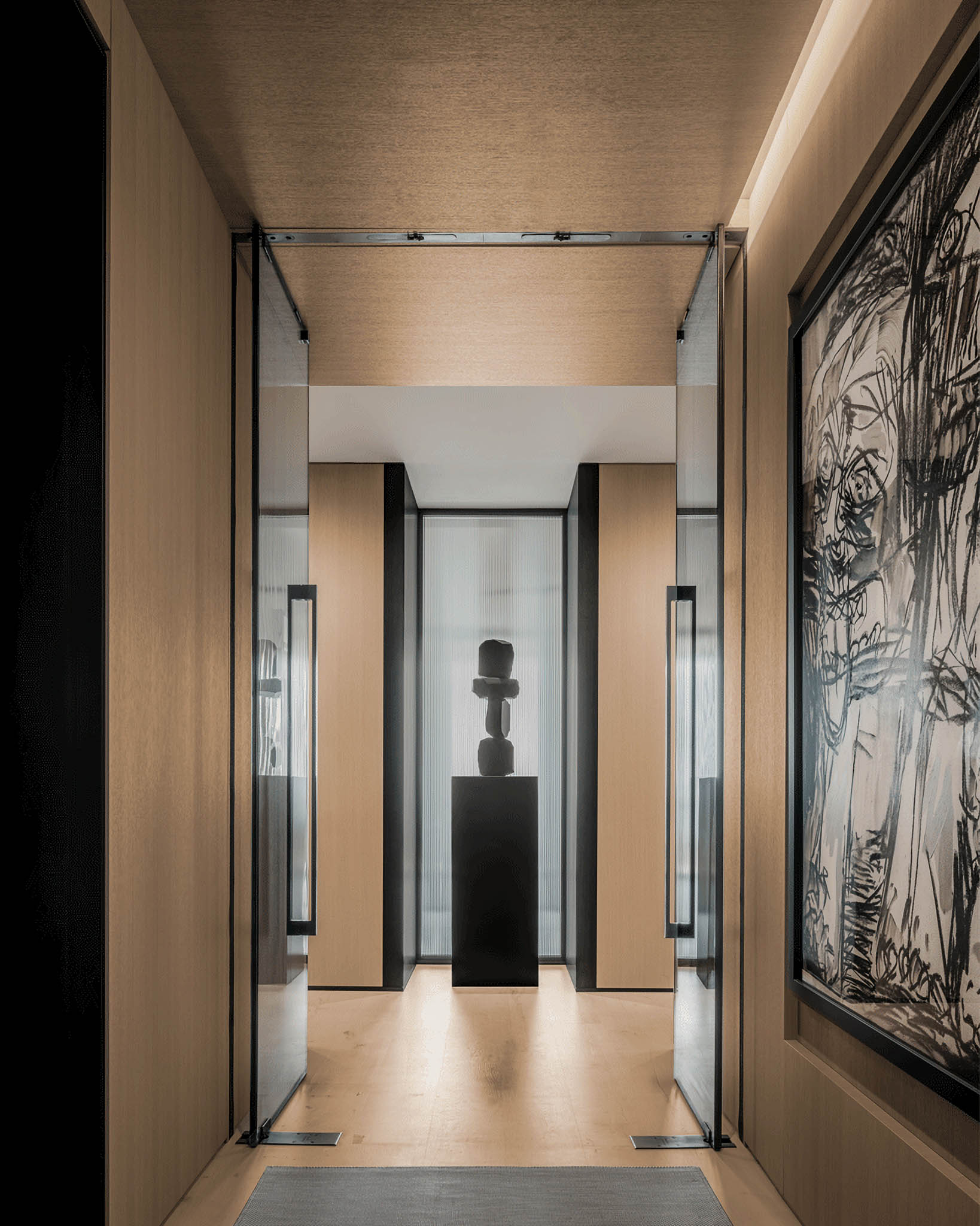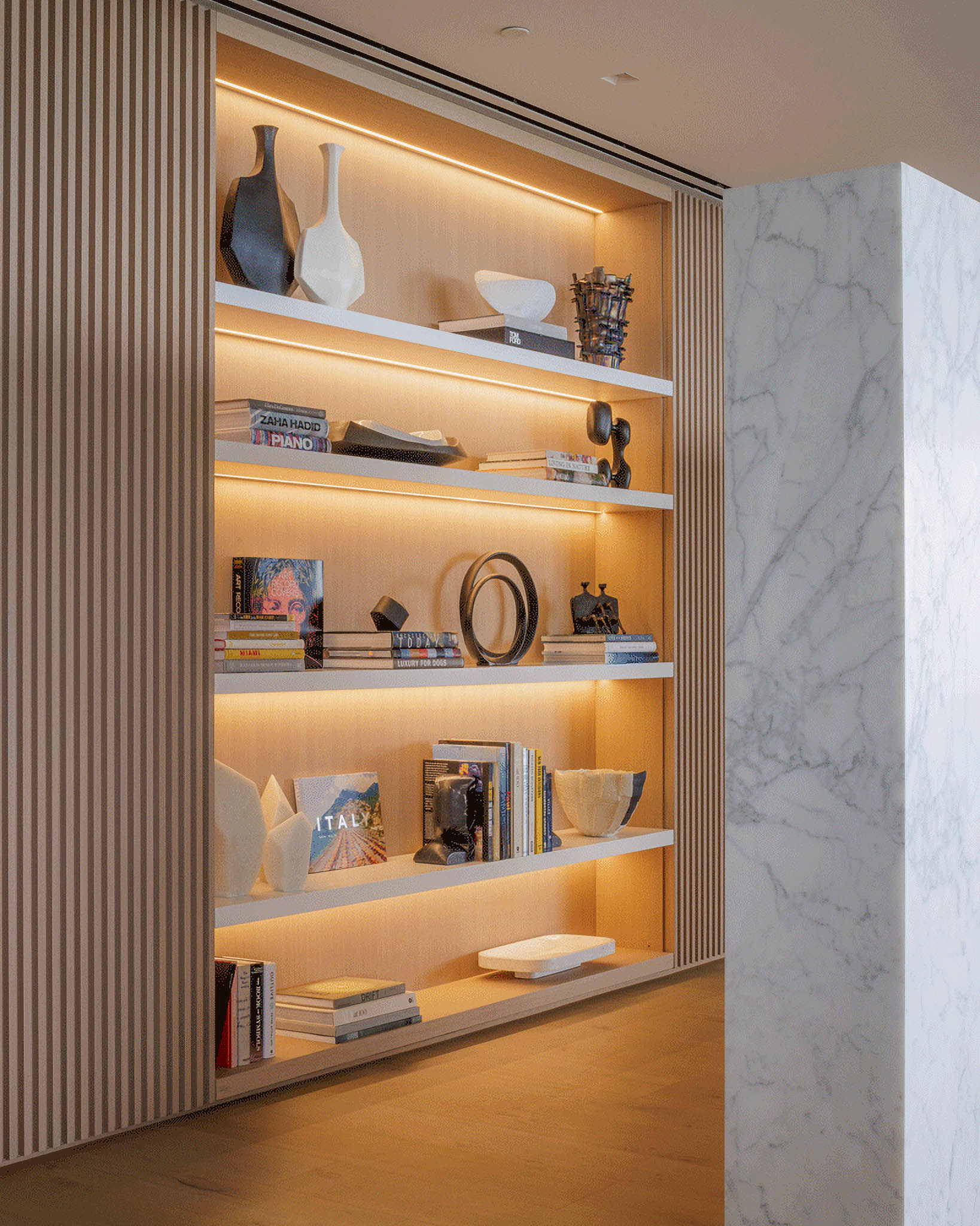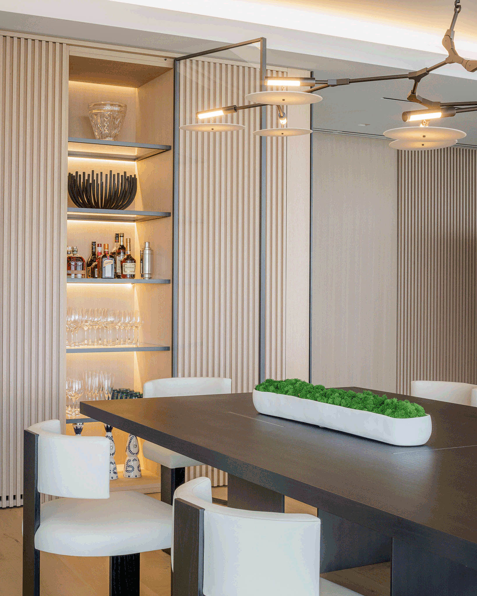 Tailored wall paneling and bespoke joinery introduce a layered sense of texture while maintaining visual clarity. Warm metal accents highlight key architectural and furniture details, adding depth without overpowering the space.