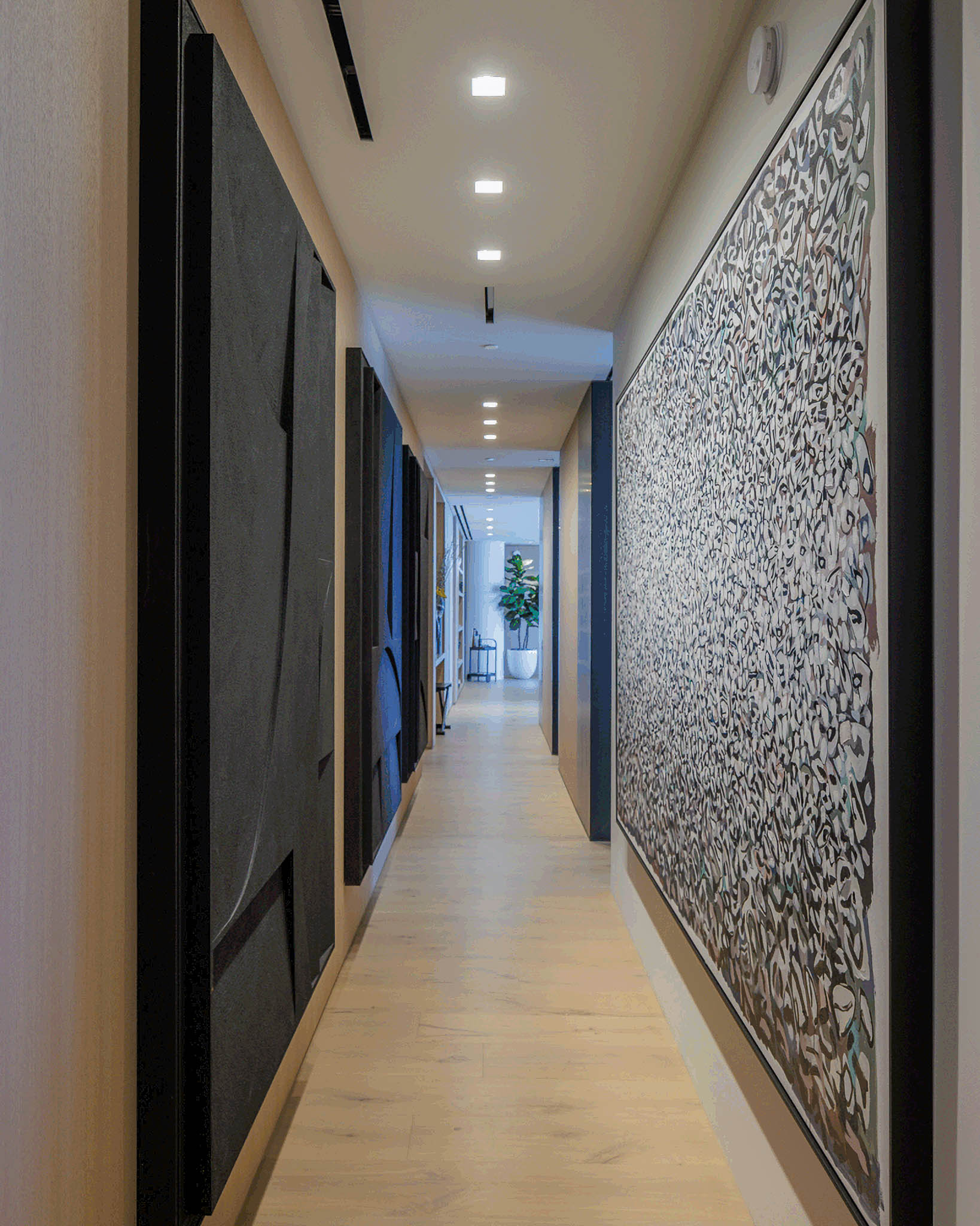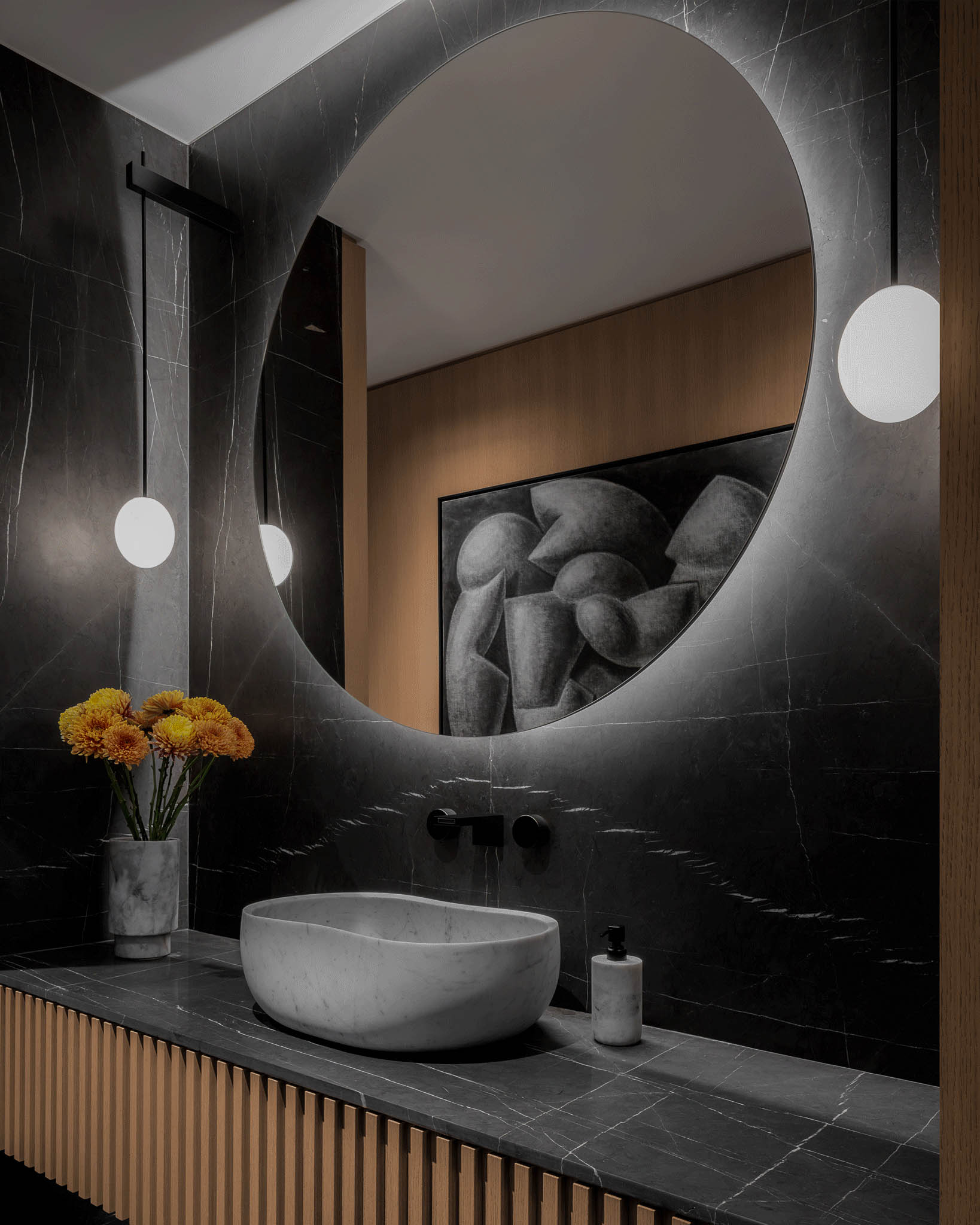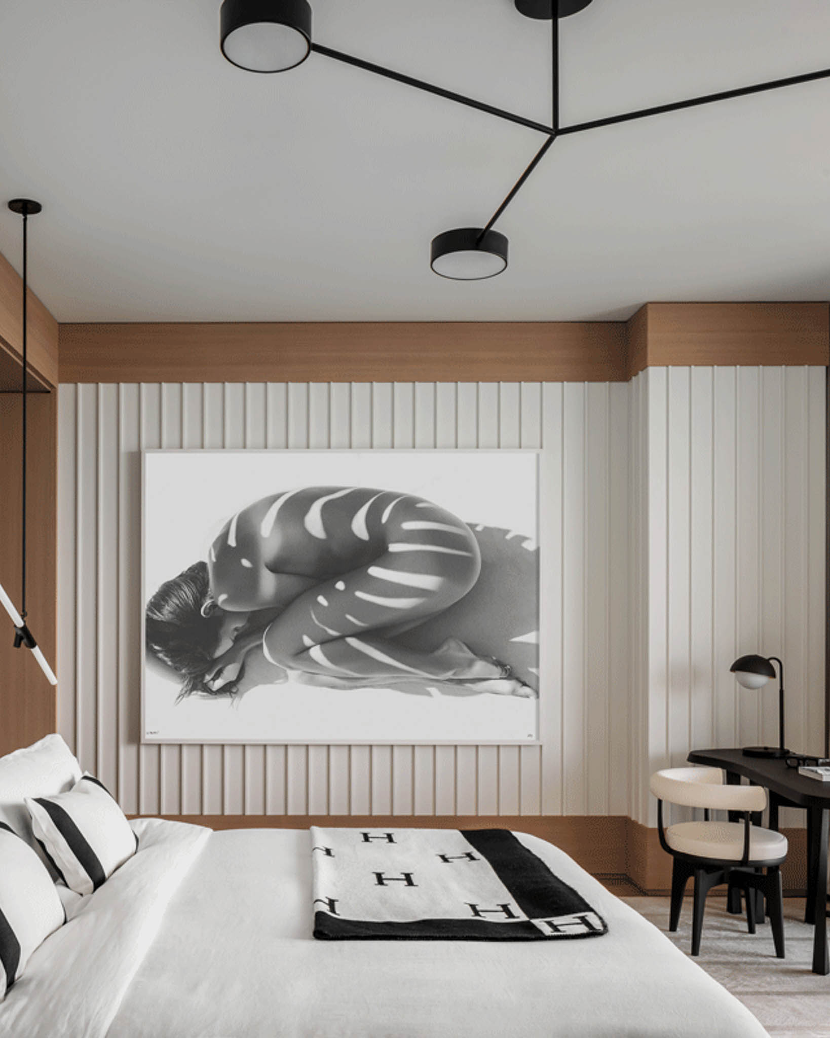 Tailored wall paneling and bespoke joinery introduce a layered sense of texture while maintaining visual clarity. Warm metal accents highlight key architectural and furniture details, adding depth without overpowering the space.