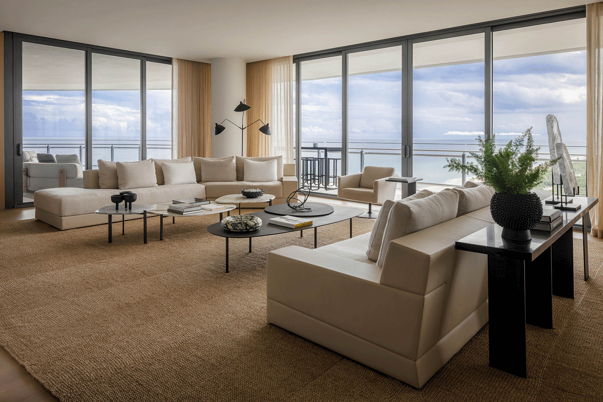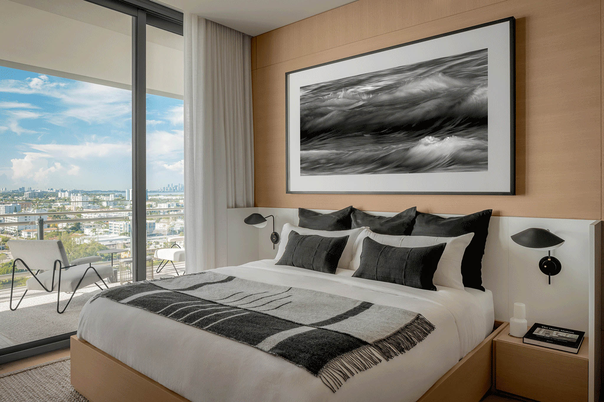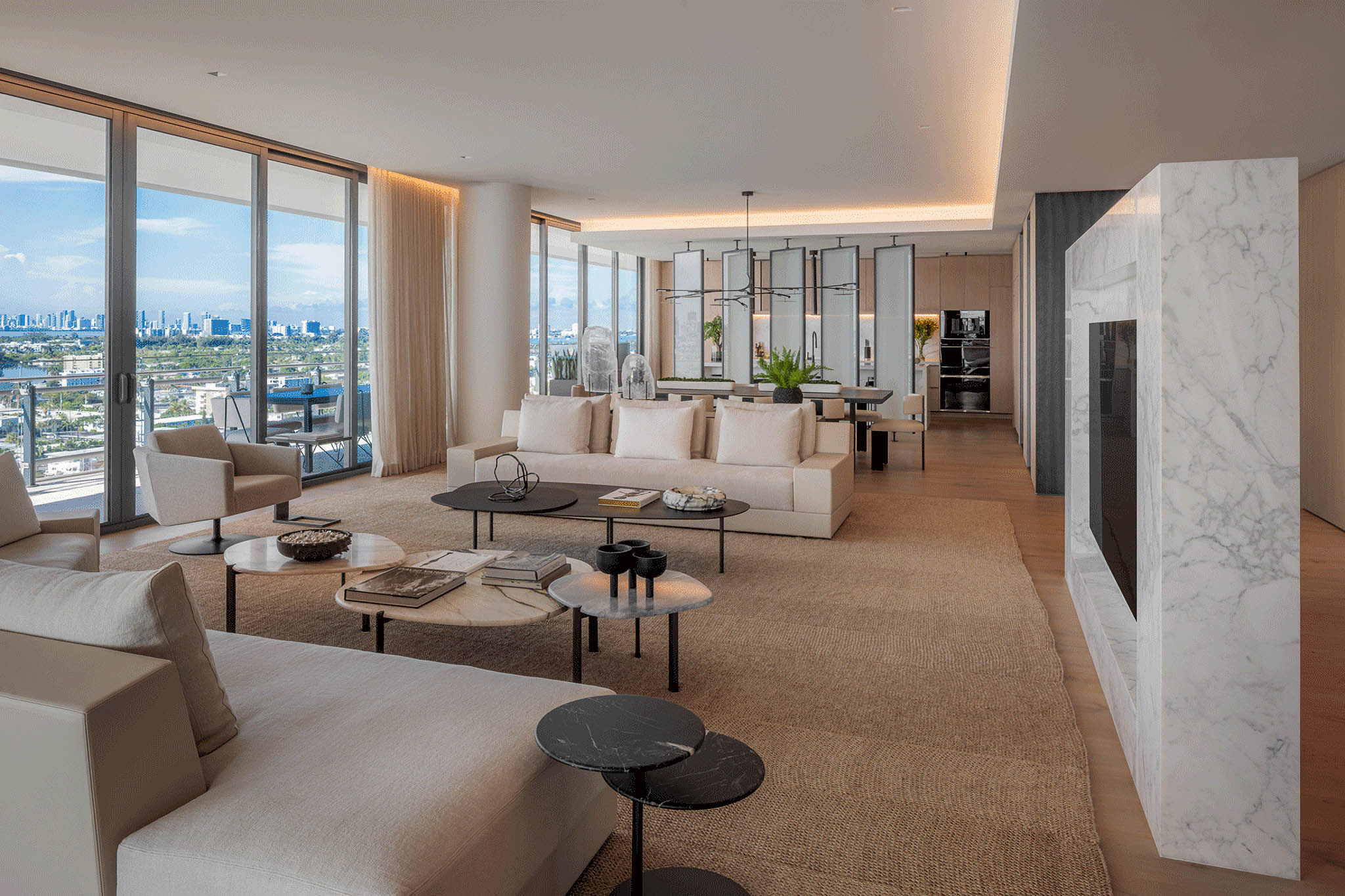 Materials play a quiet but essential role in defining the atmosphere of this apartment. Soft‑toned timber flooring runs throughout, paired with light marble and natural stone that reflect the Miami daylight and strengthen the coastal identity of the interiors.