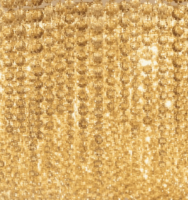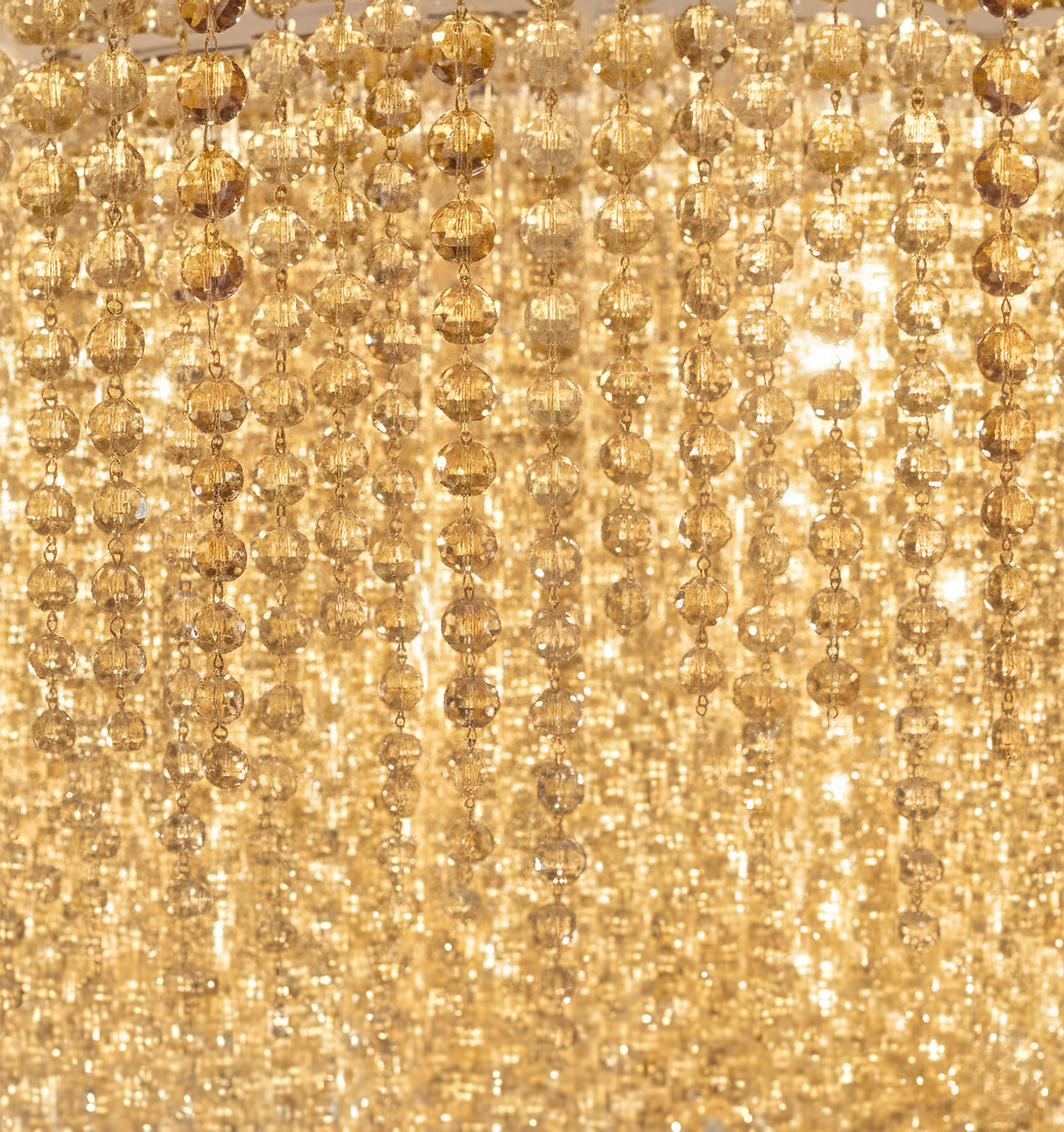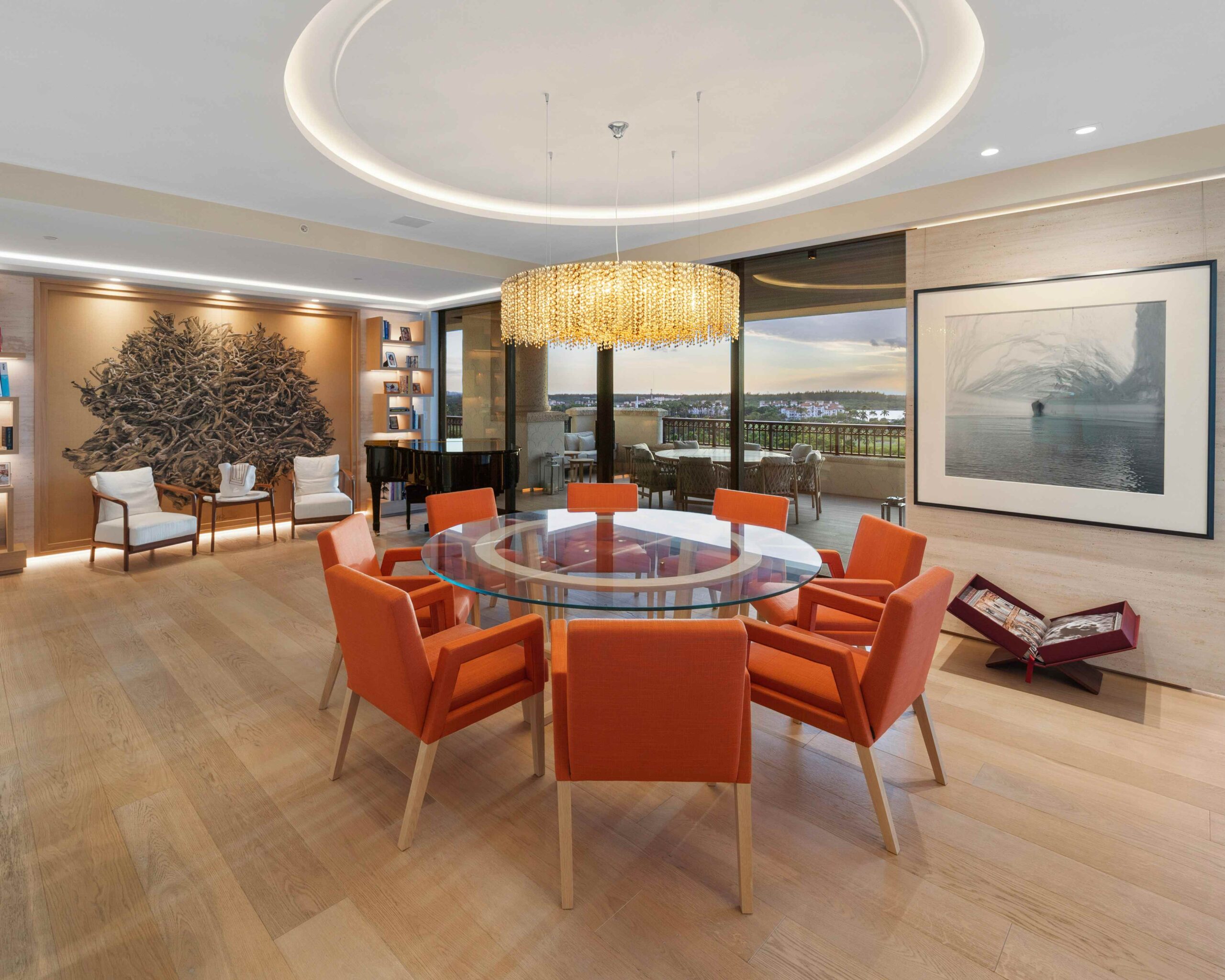 Glass chandeliers cast light, adding narrative and sculptural elegance.